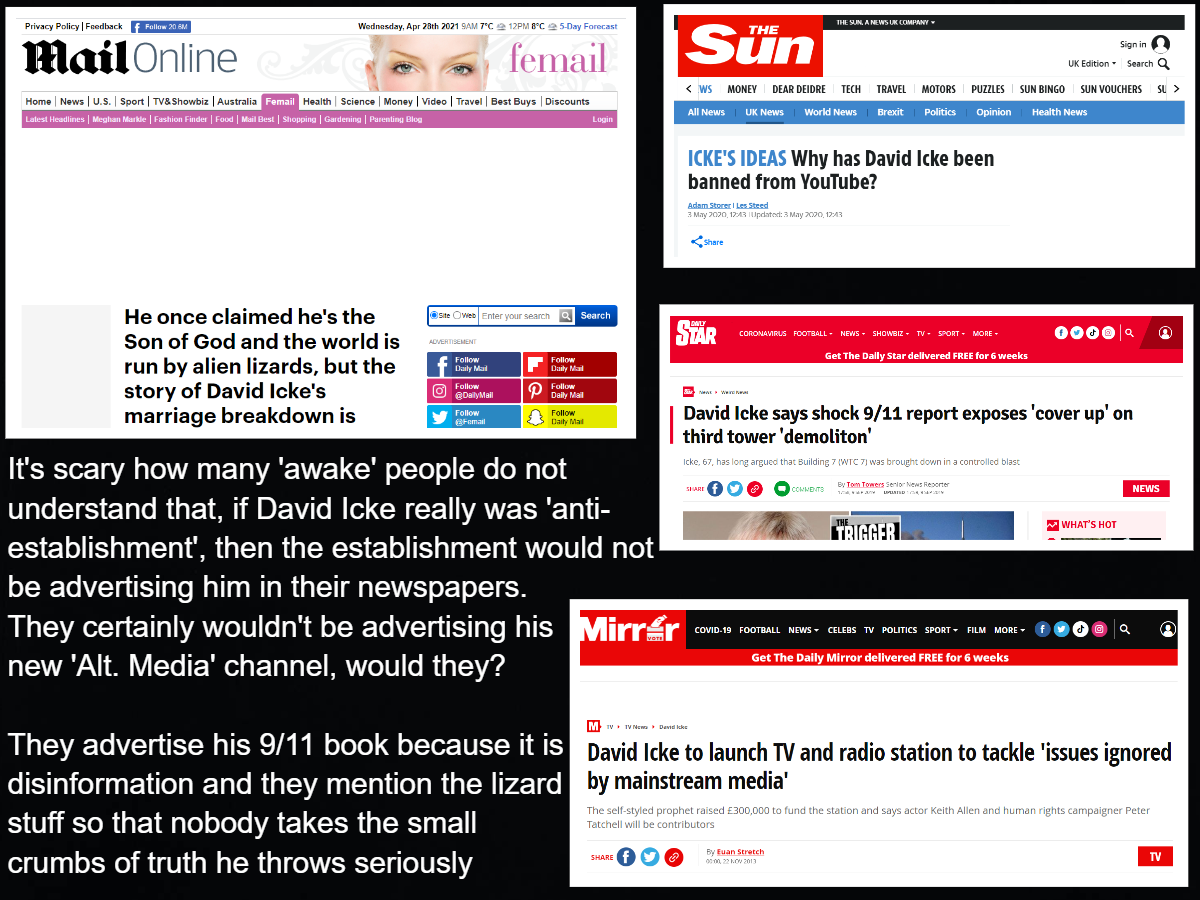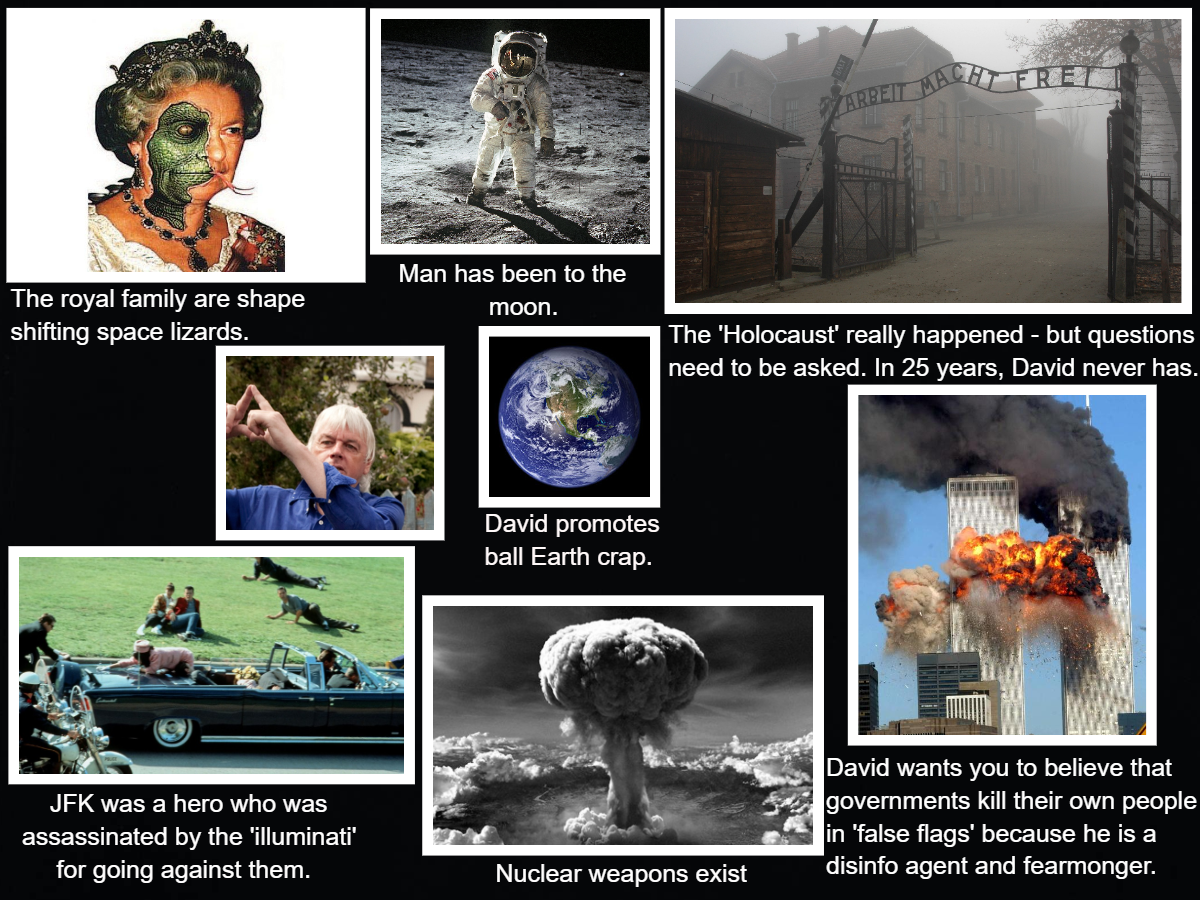 There is also the very important matter of the sheer amount of disinformation that David spreads which becomes the sort of ‘default’ babytruther position on many topics and this is why people refuse to wake up to real truth – they think they’ve found David and hit the goldmine – trust me, you haven’t.
