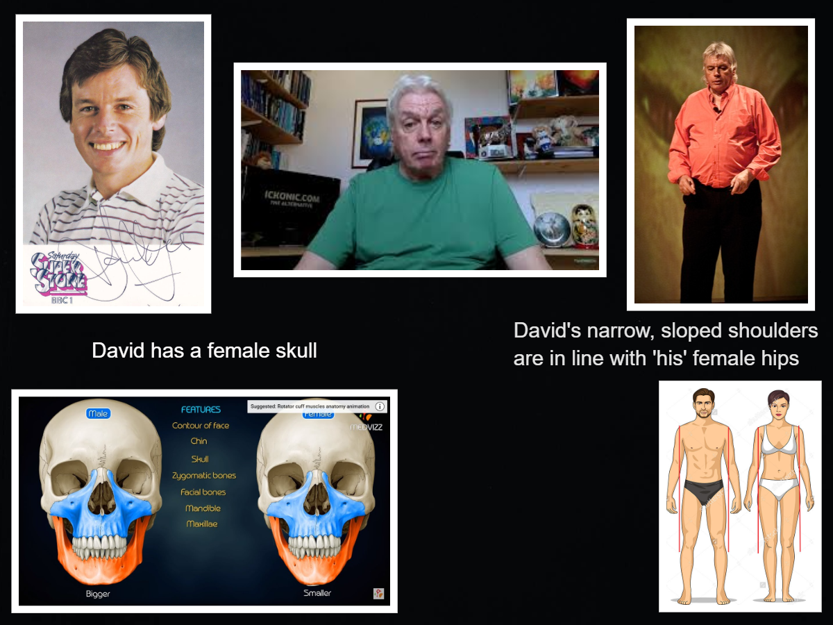 We can see again that David has the skull and shoulders of a female and we can also see the female shoulder to hips ratio. Of all the many markers that identify gender, the most accurate is that of the pelvis which is 100%. This is how they identify the gender of human remains, such is its accuracy.