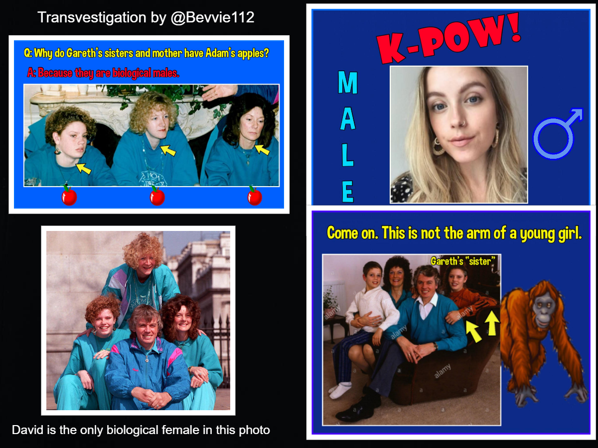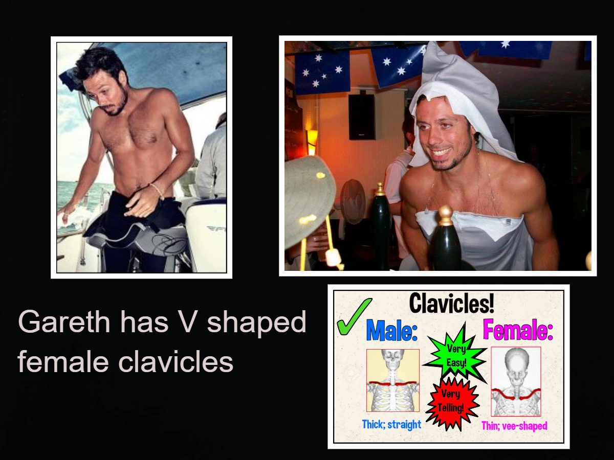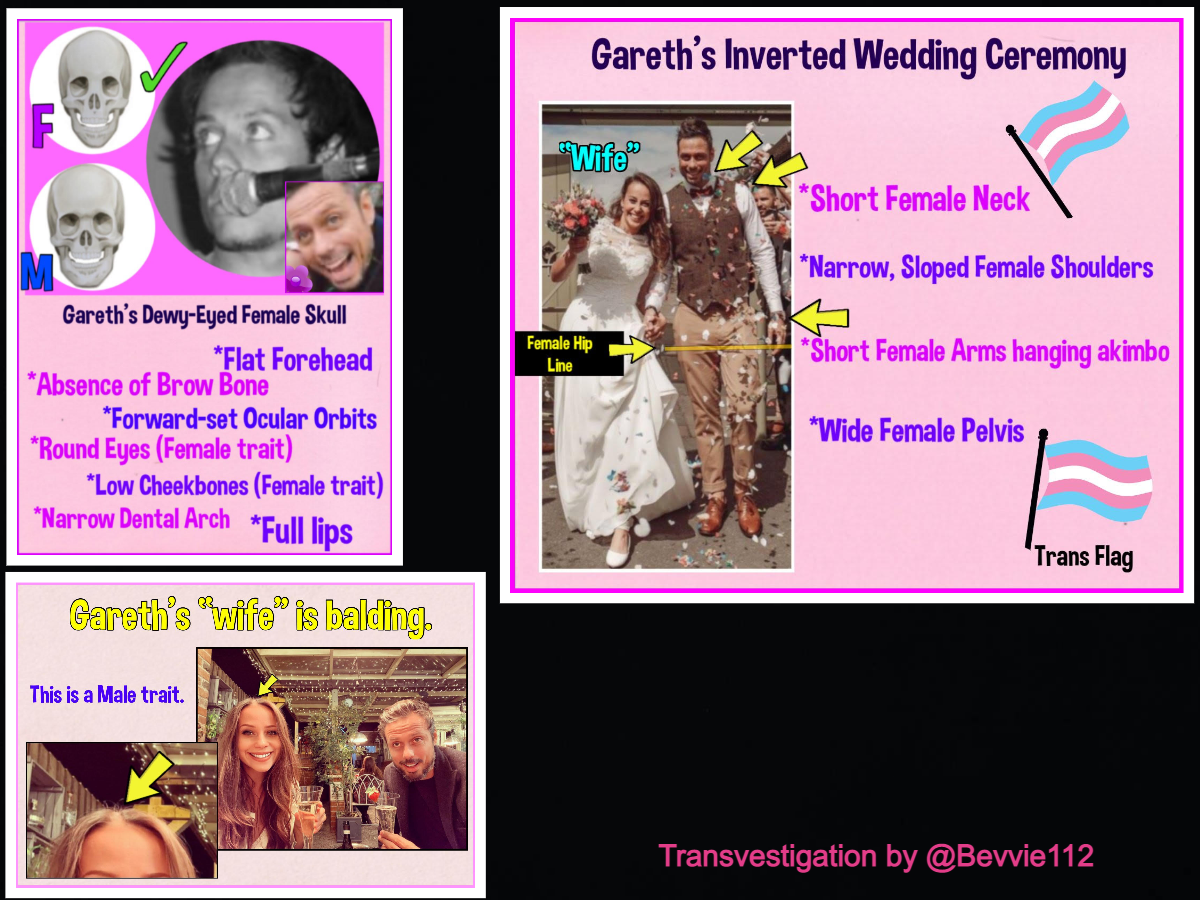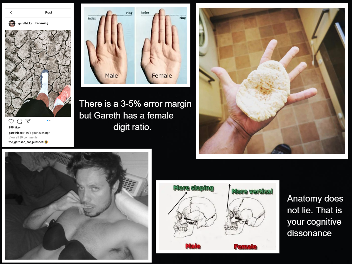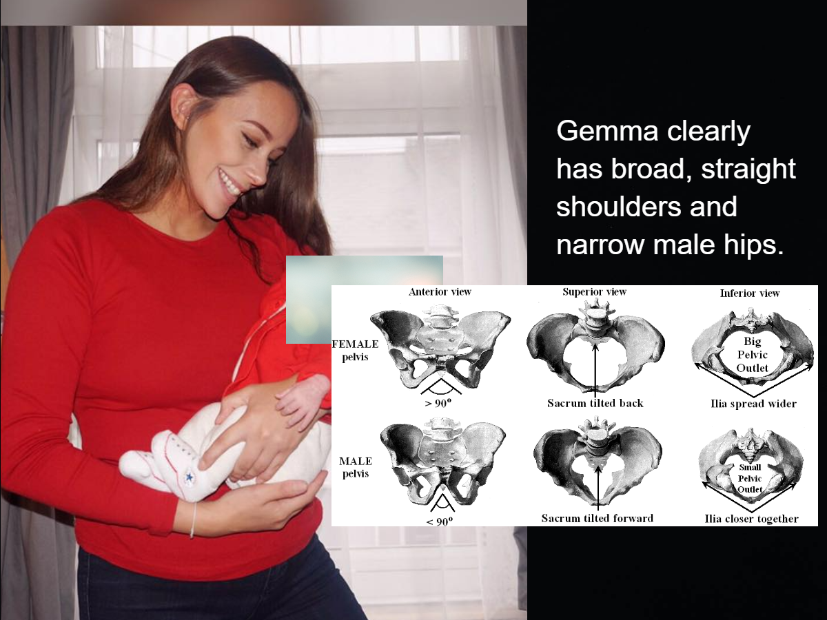 We can see above that there are multiple skeletal markers that tell us Gareth is a biological female, most notably the pelvis. If you understand the link between freemasonry and the androgyne and you understand the differences between a male and female skeleton, then this is very apparent. It is especially evident from Bev’s transvestigation that clearly states why Gareth and ‘his wife’ are an EGI couple and I have added a few more just to illustrate the point further.