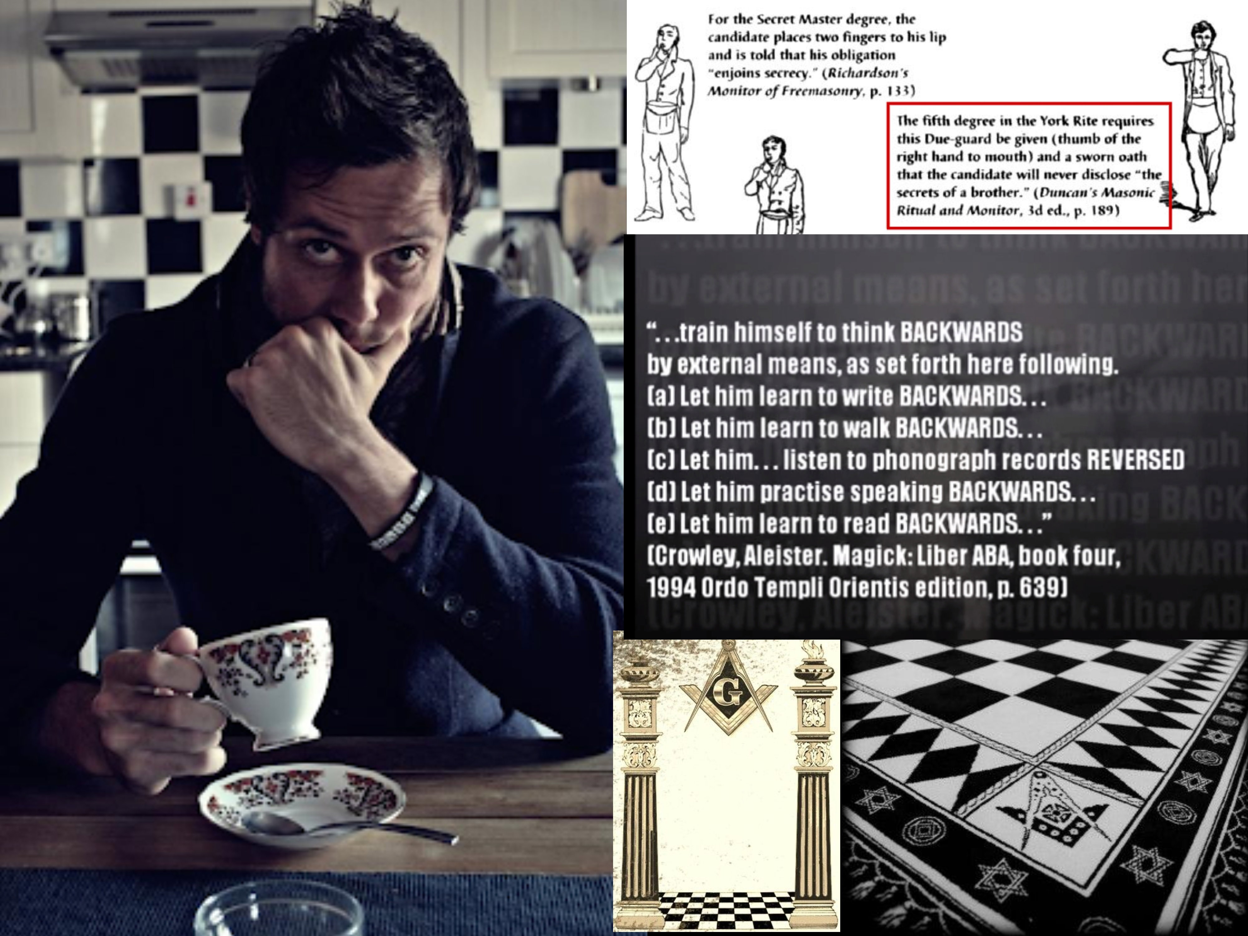 Gareth is pictured with the freemasonic black and white squares behind him for duality – they represent the enlightened (him) and the uninitiated (us). He is also seen covering his mouth to signify his silence.