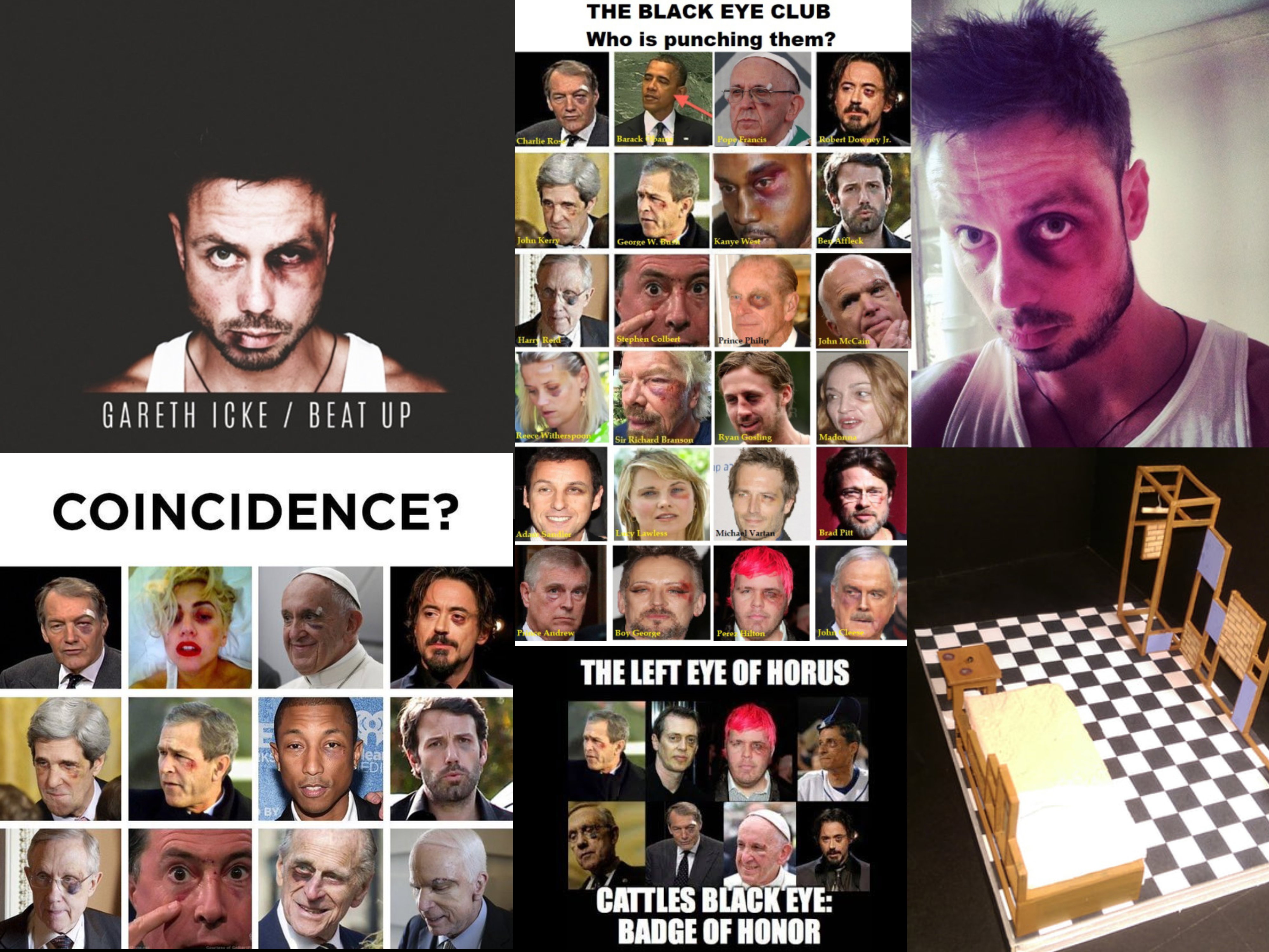 Here we can see Gareth with clear ‘Black Eye Club’ symbolism. Gareth wants us to believe that David Icke’s son, if David was legit and not a freemason, would be able to do all of this without any attention at all and David wouldn’t be having words? You don’t think he’d say “Gareth, can you stop doing all that freemasonic shit please because it’s reflecting badly on me and my work?”