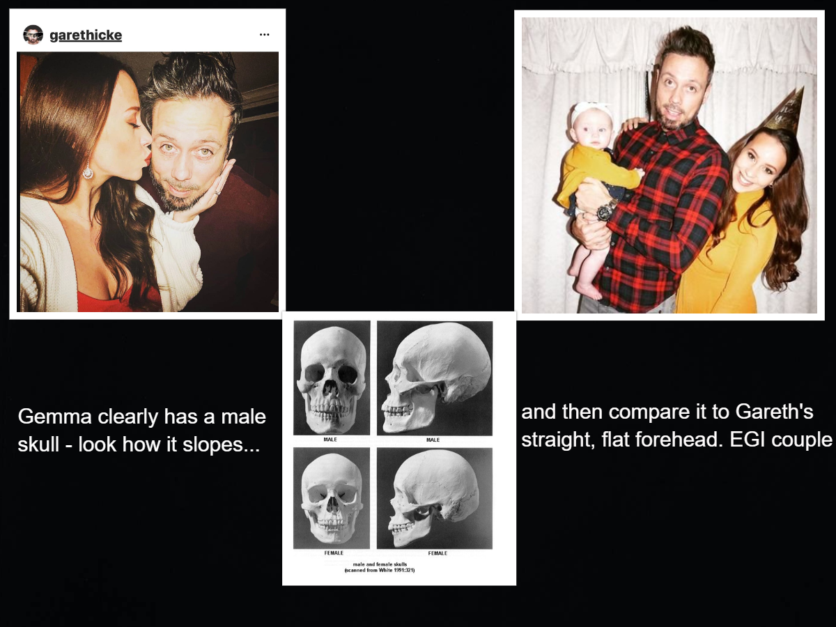 We can clearly see that Gemma has a male sloping skull and hips that simply could not give birth to ‘their child’. Remember, the pelvis is 100% accurate. The child, incidentally, also looks EGI and is pictured on Gareth’s IG making several freemasonic poses – obviously, I won’t be posting them here but if you take a look, you’ll see for yourself.