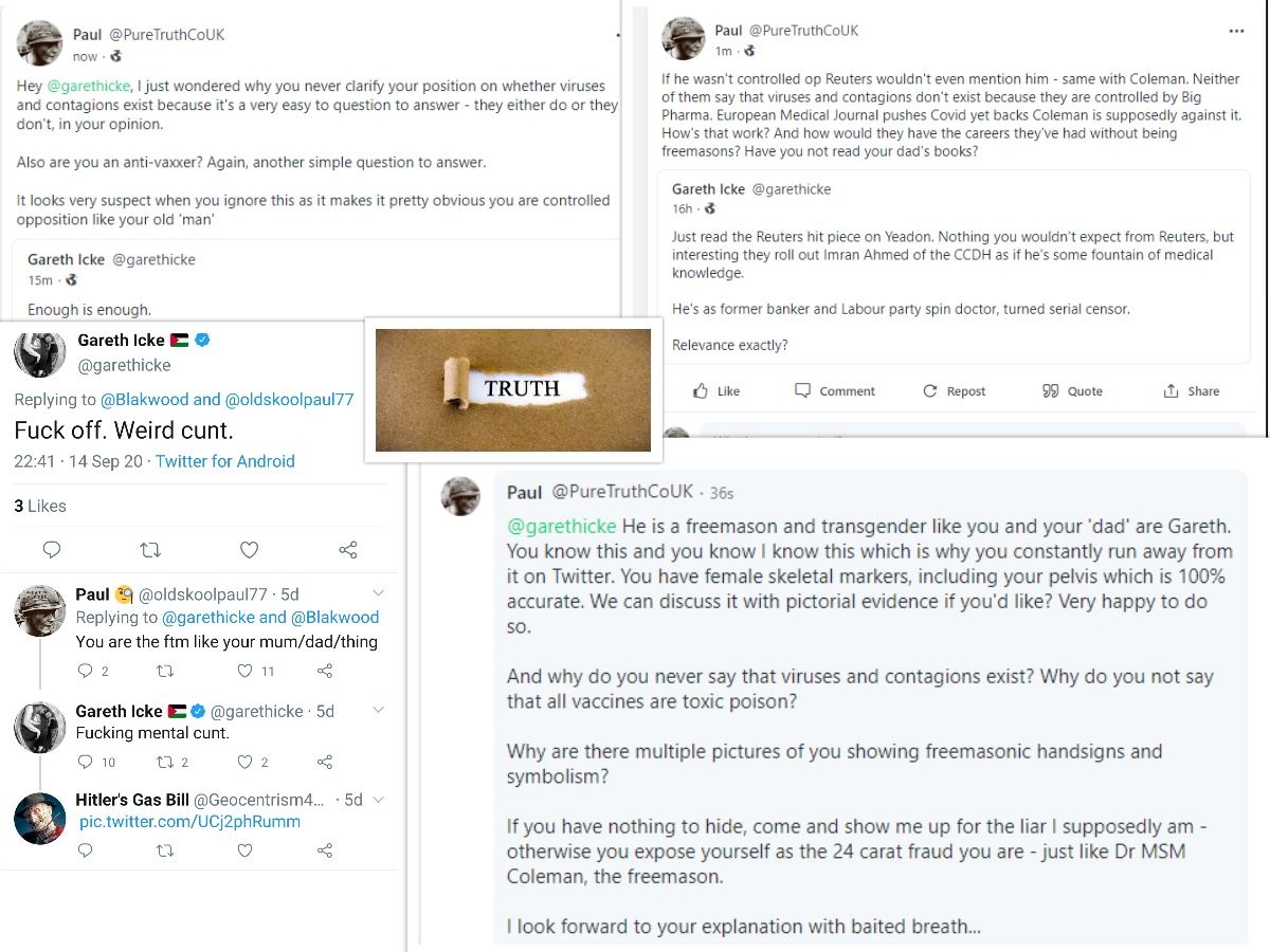 I have confronted Gareth about this and other topics on numerous occasions but, barring a Twitter row in September when he got cocky until I mentioned the EGI stuff, nothing. Then his tone changed from cocky, trustfund baby ‘Daddy’s ‘Boy’ to angry transgender freemason who has been found out. Since then, he has refused to engage with me on Twitter or Gab – he can’t even answer what is his opinion on whether viruses or contagions exist and whether he opposes all vaccines because he is a controlled agent, 100% Even has a blue tick on Twitter and for what? Being David’s ‘son’? Twitter only verify those who are part of the game and he is part of the game like his ‘dad’.