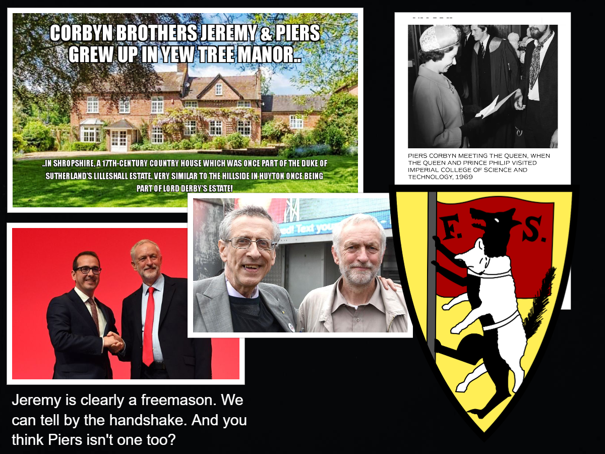 The second establishment family I’d like to mention are the Corbyns, Piers in particular. I’ve written about Piers before here and he was recently interviewed by Sean Argyle regarding my allegations of him being a freemason which we’ll get onto shortly but, firstly, how is Piers Corbyn anti-establishment? He grew up in an estate that is most definitely not a council estate and he went to ICL. He is pictured above meeting Liz Windsor and we are supposed to believe that he is opposing her agenda? On that note, Piers claimed in said interview that he has been watched by the police since 1968 so why is he meeting the monarch a year later? His brother was leader of the opposition and a freemason and you think Piers isn’t a freemason too? You think they grew up in different circles?