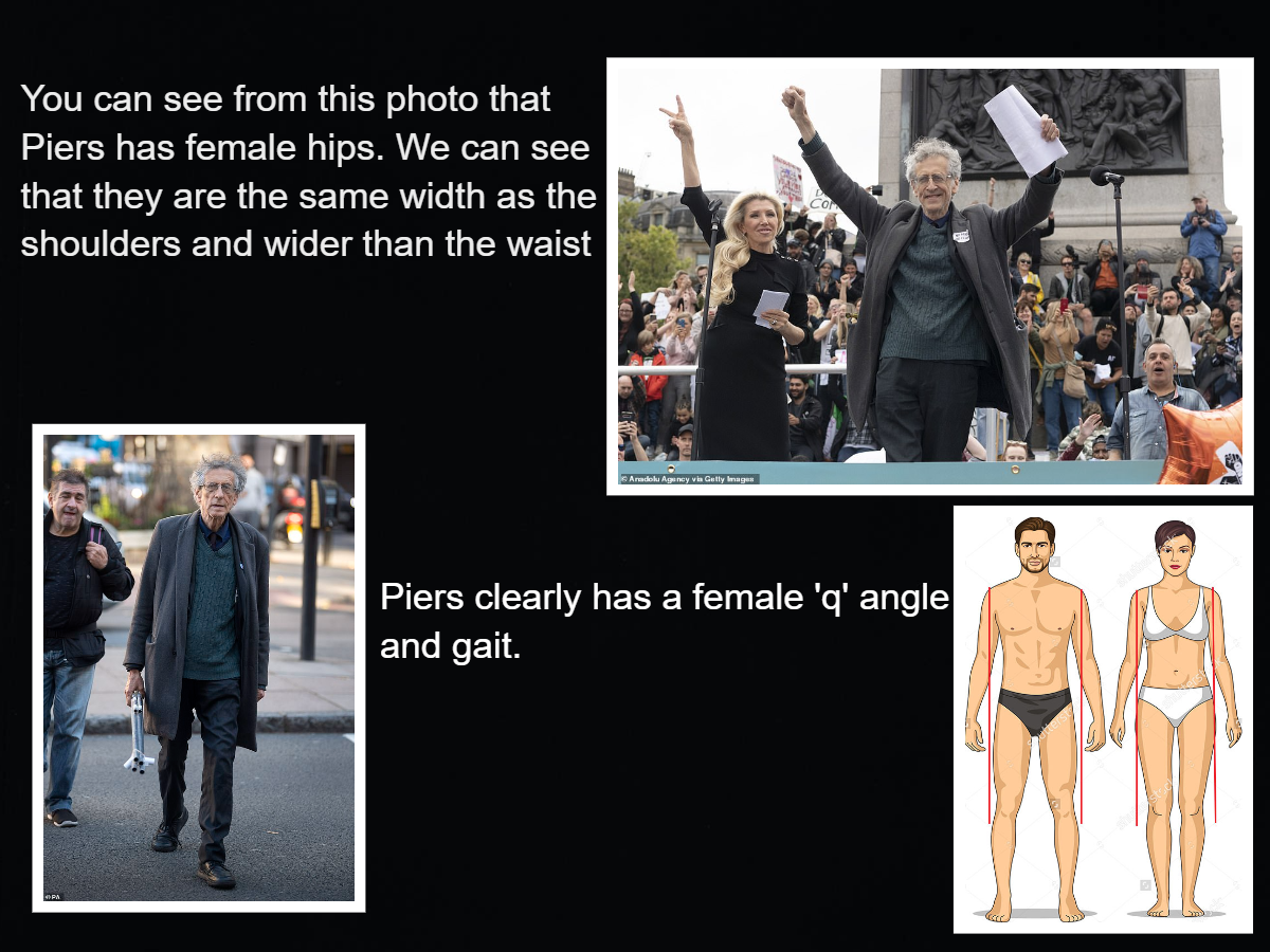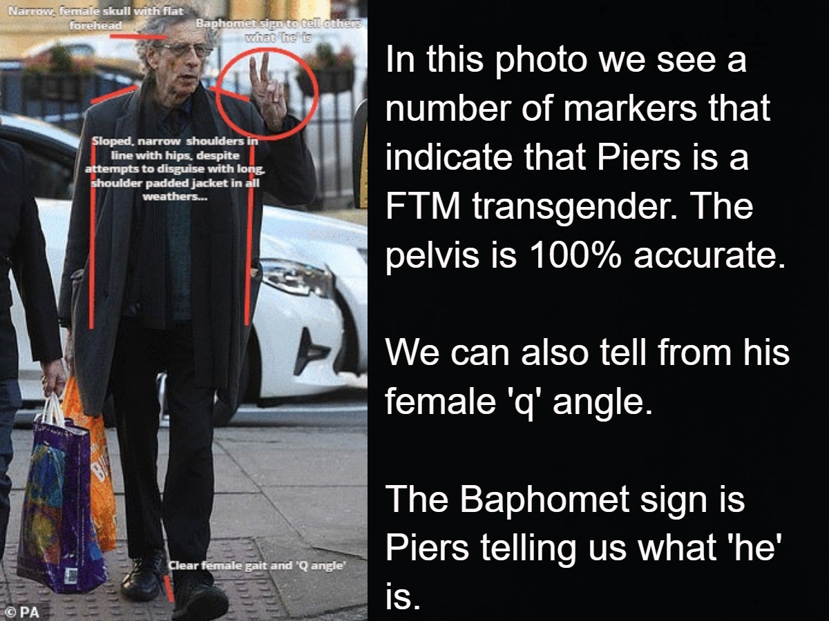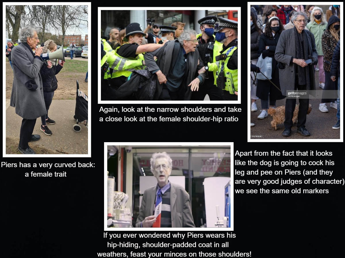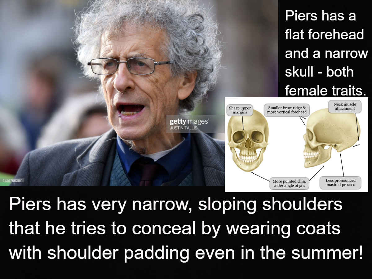 It is very clear from the evidence provided above that Piers Corbyn is a FTM EGI transgender. The pelvis is 100% on its own, which is why he always wears that big dirty coat in all weathers, something that Windows was trying to use to mock me on his gatekeeping podcast. He wears it because it hides his female hips and because it has padded shoulders. Piers has a female shoulder-hip ratio, a female digit ratio, a tiny neck, a female skull (forehead/jaw etc) and a female q angle. If you are not getting this then, as I said, please do study anatomy and the difference between male and female skeletons.