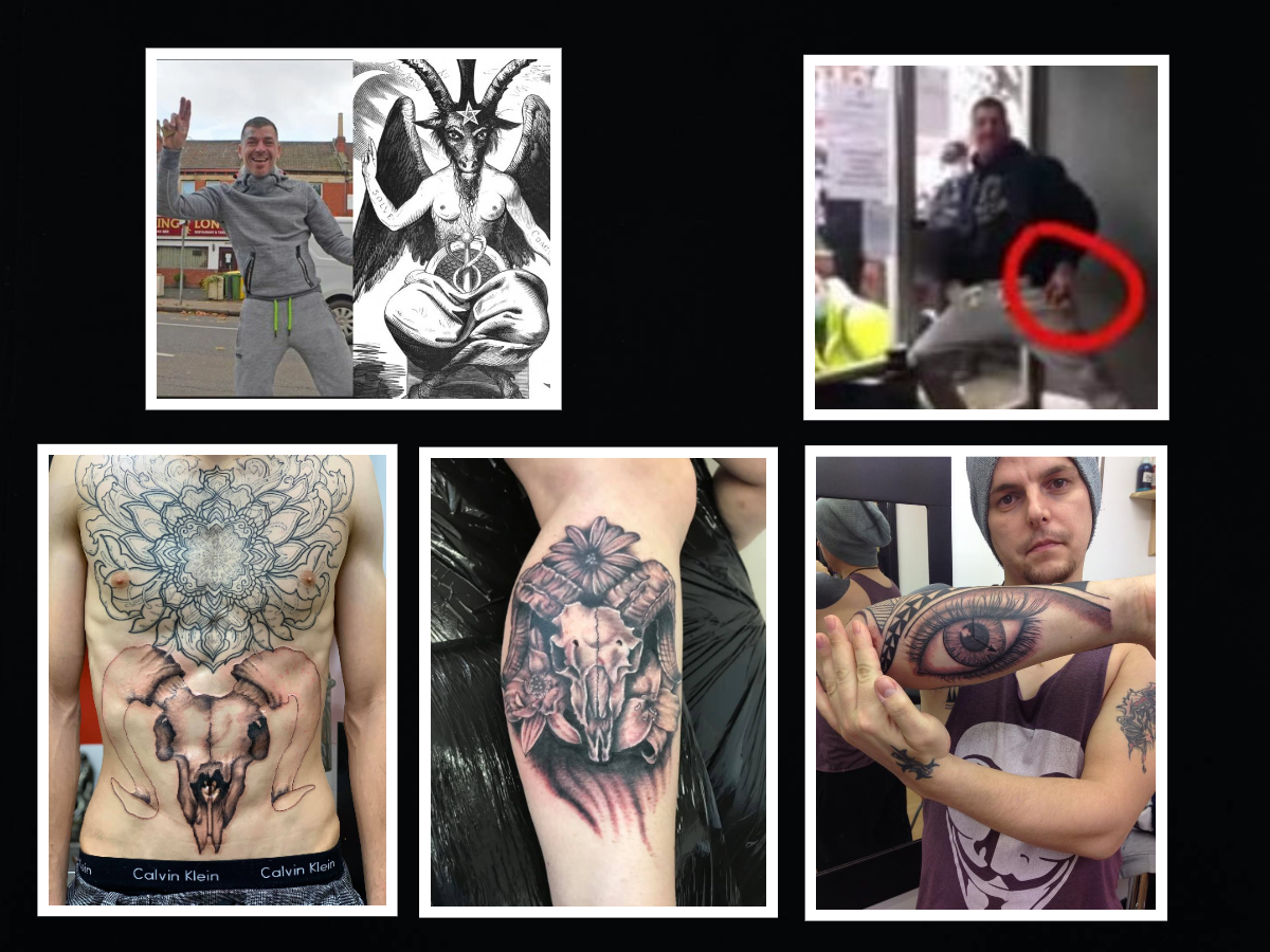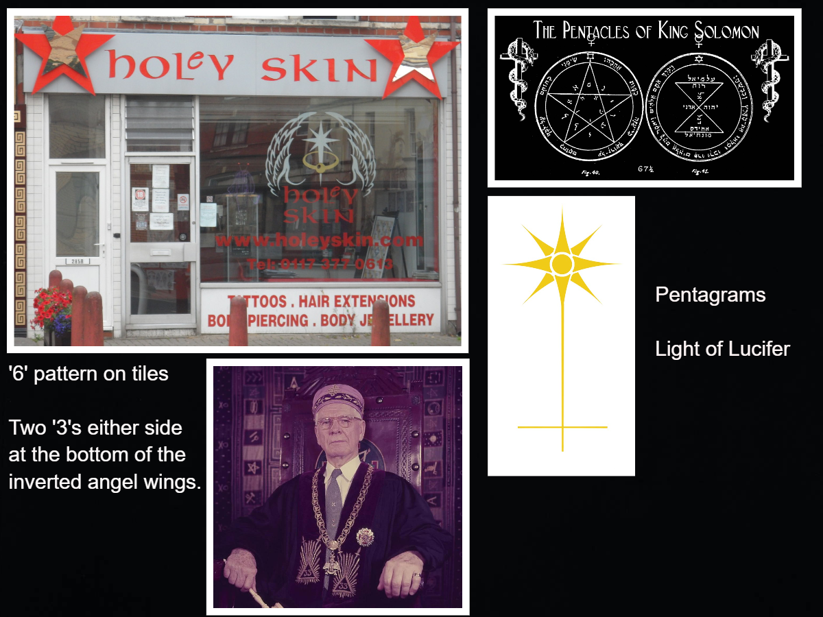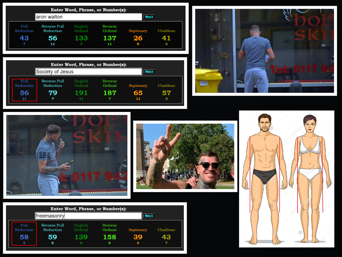 Aron has a curved back, a narrow skull, wide hips in line with the shoulders and has a page on Facebook with his tattoos that is like an A-Z of occult symbolism. The front of his shop is also full of freemasonic symbolism, and he even wears coded clothes for photo ops. Freemasonry is all about deceit.
